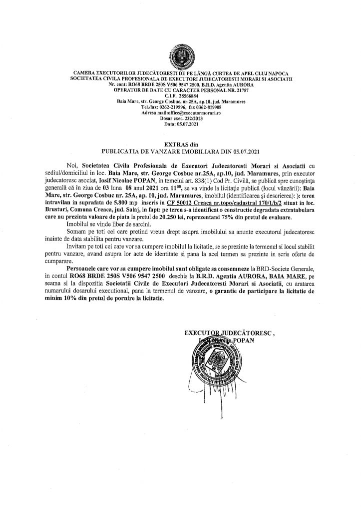 Noi, Societatea Civilă Profesională de Executori Judecătorești Morari și Asociații cu sediul în loc. Baia Mare, str. George Coșbuc, nr. 25A, ap. 10, jud. Maramureș, prin executor judecătoresc asociat, Iosif-Nicolae POPAN în temeiul art. 838(1) Cod. Pr. Civilă, se publică spre cunoștința generală că în ziua de 03 luna 08 anul 2021 ora 11.00 se va vinde la licitație publică (locul vânzării): Baia Mare, str. George Coșbuc, nr. 25A, ap. 10, jud Maramureș imobilul descris în documentul de mai jos: