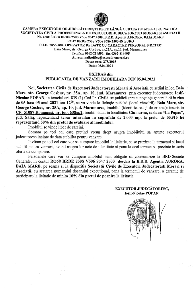ebnNoi, Societatea Civilă Profesională de Executori Judecătorești Morari și Asociații cu sediul în loc. Baia Mare, str. George Coșbuc, nr. 25A, ap. 10, jud. Maramureș, prin executor judecătoresc Iosif-Nicolae POPAN în temeiul art. 839 (1) Cod. Pr. Civilă, se publică spre cunoștința generală că în ziua de 05 luna 05 anul 2021 ora 12.00 se va vinde la licitație publică (locul vânzării): Baia Mare, str. George Coșbuc, nr. 25A, ap. 10, jud Maramureș din imobilul descris în documentul de mai jos: