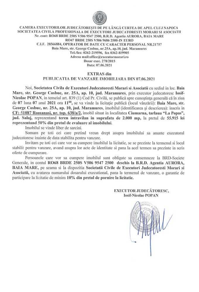 Noi, Societatea Civilă Profesională de Executori Judecătorești Morari și Asociații cu sediul în loc. Baia Mare, str. George Coșbuc, nr. 25A, ap. 10, jud. Maramureș, prin executor judecătoresc Iosif-Nicolae POPAN în temeiul art. 839 (1) Cod. Pr. Civilă, se publică spre cunoștința generală că în ziua de 07 luna 07 anul 2021 ora 11.00 se va vinde la licitație publică (locul vânzării): Baia Mare, str. George Coșbuc, nr. 25A, ap. 10, jud Maramureș imobilul descris în documentul de mai jos: