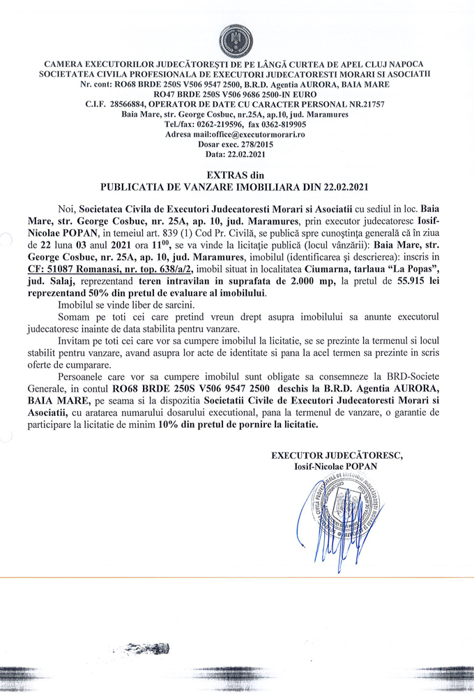 Noi, Societatea Civilă Profesională de Executori Judecătorești Morari și Asociații cu sediul în loc. Baia Mare, str. George Coșbuc, nr. 25A, ap. 10, jud. Maramureș, prin executor judecătoresc Iosif-Nicolae POPAN în temeiul art. 839 (1) Cod. Pr. Civilă, se publică spre cunoștința generală că în ziua de 22 luna 03 anul 2021 ora 11.00 se va vinde la licitație publică (locul vânzării): Baia Mare, str. George Coșbuc, nr. 25A, ap. 10, jud Maramureș din imobilul descris în documentul de mai jos: