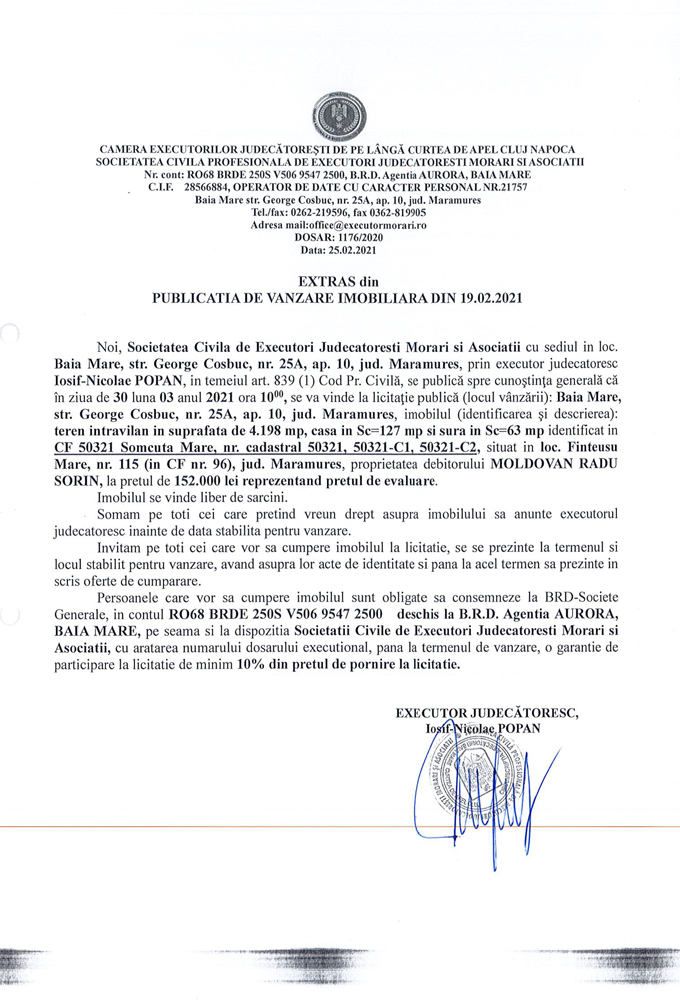 Noi, Societatea Civilă Profesională de Executori Judecătorești Morari și Asociații cu sediul în loc. Baia Mare, str. George Coșbuc, nr. 25A, ap. 10, jud. Maramureș, prin executor judecătoresc Iosif-Nicolae POPAN în temeiul art. 839 (1) Cod. Pr. Civilă, se publică spre cunoștința generală că în ziua de 30 luna 03 anul 2021 ora 10.00 se va vinde la licitație publică (locul vânzării): Baia Mare, str. George Coșbuc, nr. 25A, ap. 10, jud Maramureș din imobilul descris în documentul de mai jos: