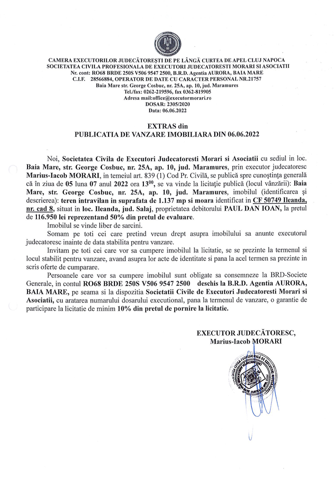 Noi, Societatea Civilă Profesională de Executori Judecătorești Morari și Asociații cu sediul în loc. Baia Mare, str. George Coșbuc, nr. 25A, ap. 10, jud. Maramureș, prin executor judecătoresc Iosif-Nicolae POPAN în temeiul art. 839 (1) Cod. Pr. Civilă, se publică spre cunoștința generală că în ziua de 05 luna 07 anul 2022 ora 13.00, se va vinde la licitație publică (locul vânzării): Baia Mare, str. George Coșbuc, nr. 25A, ap. 10, jud Maramureș, imobilul descris în documentul de mai jos: