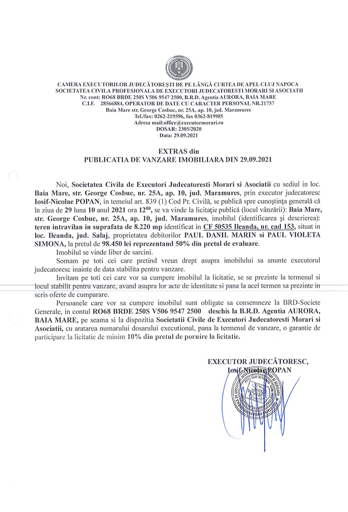 Noi, Societatea Civilă Profesională de Executori Judecătorești Morari și Asociații cu sediul în loc. Baia Mare, str. George Coșbuc, nr. 25A, ap. 10, jud. Maramureș, prin executor judecătoresc Iosif-Nicolae POPAN în temeiul art. 839 (1) Cod. Pr. Civilă, se publică spre cunoștința generală că în ziua de 29 luna 10 anul 2021 ora 12.00, se va vinde la licitație publică (locul vânzării): Baia Mare, str. George Coșbuc, nr. 25A, ap. 10, jud Maramureș imobilul descris în documentul de mai jos: