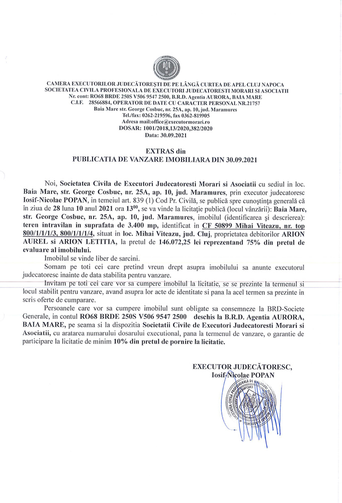 Noi, Societatea Civilă Profesională de Executori Judecătorești Morari și Asociații cu sediul în loc. Baia Mare, str. George Coșbuc, nr. 25A, ap. 10, jud. Maramureș, prin executor judecătoresc Iosif-Nicolae POPAN în temeiul art. 839 (1) Cod. Pr. Civilă, se publică spre cunoștința generală că în ziua de 28 luna 10 anul 2021 ora 13.00, se va vinde la licitație publică (locul vânzării): Baia Mare, str. George Coșbuc, nr. 25A, ap. 10, jud Maramureș imobilul descris în documentul de mai jos: