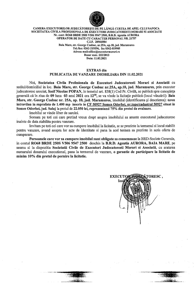 Noi, Societatea Civilă Profesională de Executori Judecătorești Morari și Asociații cu sediul în loc. Baia Mare, str. George Coșbuc, nr. 25A, ap. 10, jud. Maramureș, prin executor judecătoresc Iosif-Nicolae POPAN în temeiul art. 838(1) Cod. Pr. Civilă, se publică spre cunoștința generală că în ziua de 09 luna 03 anul 2021 ora 12.00 se va vinde la licitație publică (locul vânzării): Baia Mare, str. George Coșbuc, nr. 25A, ap. 10, jud Maramureș din imobilul descris în documentul de mai jos: