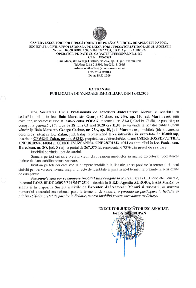 Noi, Societatea Civila Profesionala de Executori Judecatoresti Morari si Asociatii cu sediul in loc. Baia Mare, str. George Cosbuc, nr. 25A, ap. 10, jud. Maramures, prin executor judecatoresc Iosif-Nicolae POPAN, in temeiul art. 838(1) Cod. Pr. Civila, se publica spre cunostinta generala ca in ziua de 18 luna 03 anul 2020 ora 11,00, se va vinde la licitatie publica (locul vanzarii): Baia Mare, str. George Cosbuc, nr. 25A, ap. 10, jud Maramures, imobilul descris in documentul de mai jos: