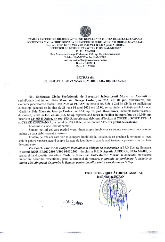 Noi, Societatea Civilă Profesională de Executori Judecătorești Morari și Asociații cu sediul în loc. Baia Mare, str. George Coșbuc, nr. 25A, ap. 10, jud. Maramureș, prin executor judecătoresc Iosif-Nicolae POPAN în temeiul art. 838(1) Cod. Pr. Civilă, se publică spre cunoștința generală că în ziua de 21 luna 01 anul 2021 ora 12,00 se va vinde la licitație publică (locul vânzării): Baia Mare, str. George Coșbuc, nr. 25A, ap. 10, jud Maramureș din imobilul descris în documentul de mai jos: