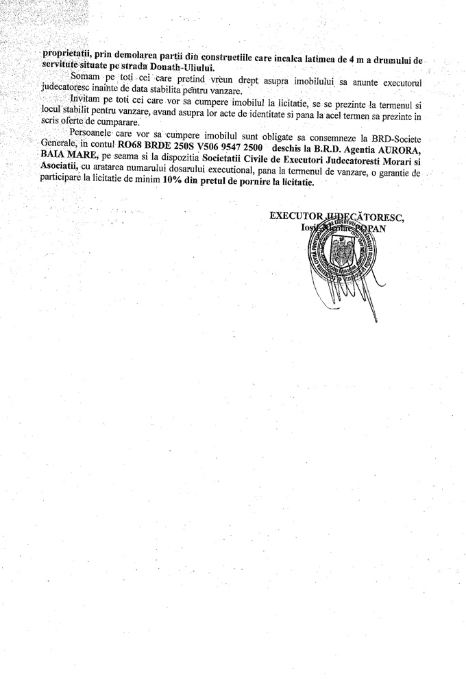 Noi, Societatea Civilă Profesională de Executori Judecătorești Morari și Asociații cu sediul/domiciliul în loc. Baia Mare, str. George Coșbuc, nr. 25A, ap. 10, jud. Maramureș, prin executor judecătoresc asociat Iosif-Nicolae POPAN, în temeiul art. 839 (1) Cod. Pr. Civilă, se publică spre cunoștința generală că în ziua de 14 luna 07 anul 2022 ora 13.00, se va vinde la licitație publică (locul vânzării): Baia Mare, str. George Coșbuc, nr. 25A, ap. 10, jud Maramureș, imobilul descris în documentul de mai jos: