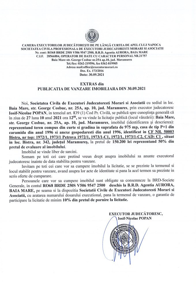 Noi, Societatea Civilă Profesională de Executori Judecătorești Morari și Asociații cu sediul în loc. Baia Mare, str. George Coșbuc, nr. 25A, ap. 10, jud. Maramureș, prin executor judecătoresc Iosif-Nicolae POPAN în temeiul art. 839 (1) Cod. Pr. Civilă, se publică spre cunoștința generală că în ziua de 27 luna 10 anul 2021 ora 12.00, se va vinde la licitație publică (locul vânzării): Baia Mare, str. George Coșbuc, nr. 25A, ap. 10, jud Maramureș imobilul descris în documentul de mai jos: