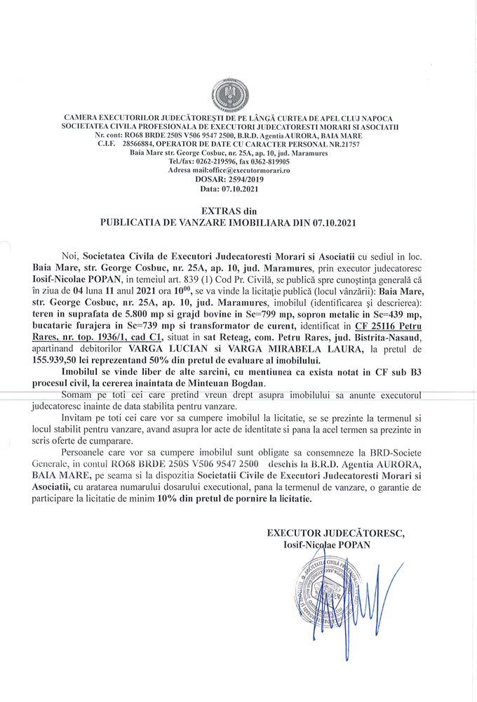 Noi, Societatea Civilă Profesională de Executori Judecătorești Morari și Asociații cu sediul în loc. Baia Mare, str. George Coșbuc, nr. 25A, ap. 10, jud. Maramureș, prin executor judecătoresc Iosif-Nicolae POPAN în temeiul art. 839 (1) Cod. Pr. Civilă, se publică spre cunoștința generală că în ziua de 04 luna 11 anul 2021 ora 10.00, se va vinde la licitație publică (locul vânzării): Baia Mare, str. George Coșbuc, nr. 25A, ap. 10, jud Maramureș, imobilul descris în documentul de mai jos: