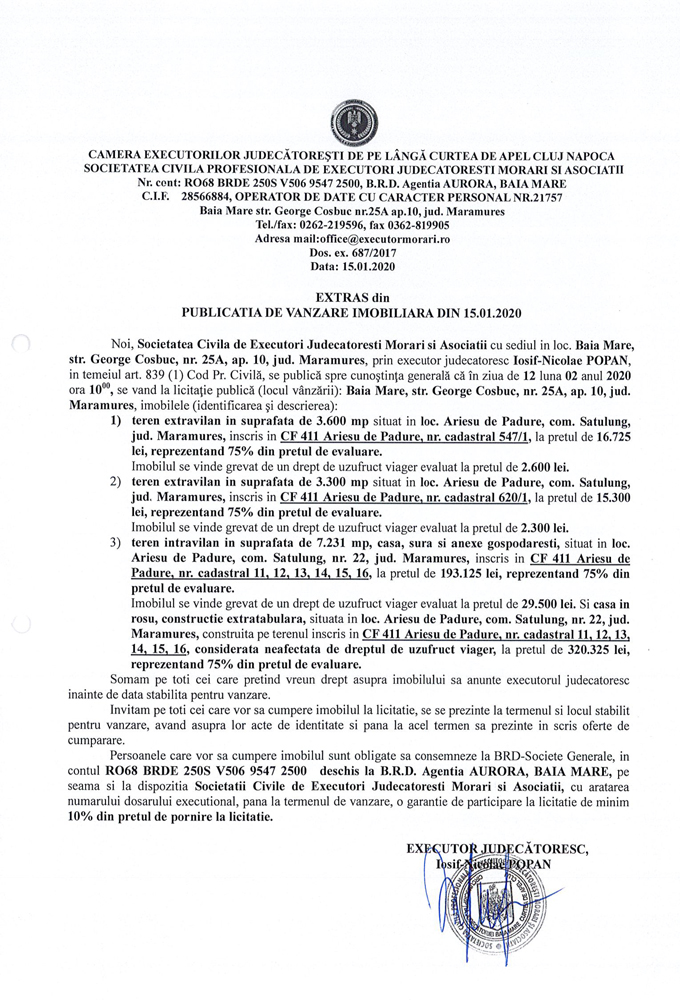 Noi, Societatea Civila Profesionala de Executori Judecatoresti Morari si Asociatii cu sediul in loc. Baia Mare, str. George Cosbuc, nr. 25A, ap. 10, jud. Maramures, prin executor judecatoresc Iosif-Nicolae POPAN, in temeiul art. 839 (1) Cod. Pr. Civila, se publica spre cunostinta generala ca in ziua de 12 luna 02 anul 2020 ora 10.00, se va vinde la licitatie publica (locul vanzarii): Baia Mare, str. George Cosbuc, nr. 25A, ap. 10, jud Maramures, imobilul descris in documentul de mai jos: