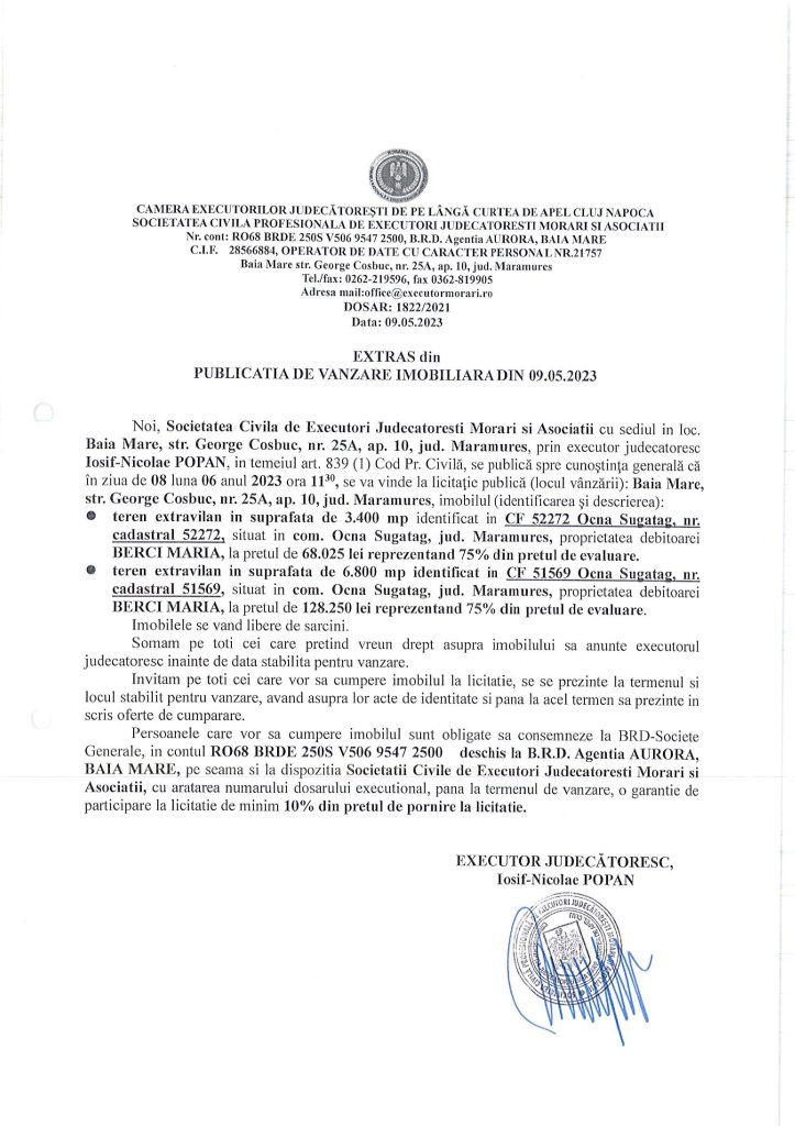 Vânzare terenuri extravilane în Ocna Șugatag – Extras publicatie imobiliara, din data de 09. 05. 2023