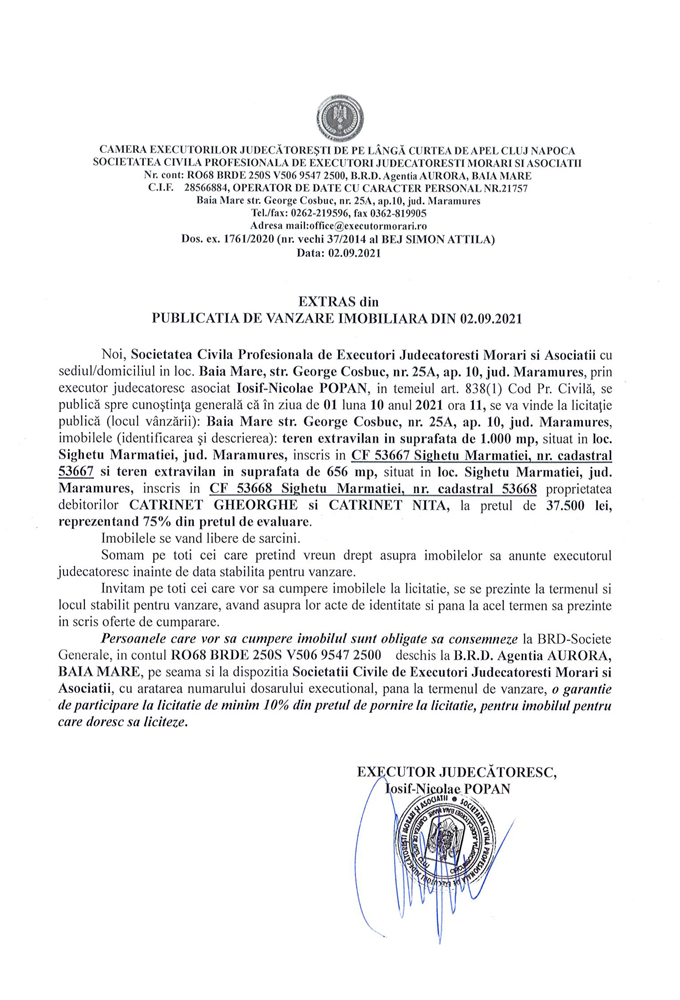 Noi, Societatea Civilă Profesională de Executori Judecătorești Morari și Asociații cu sediul în loc. Baia Mare, str. George Coșbuc, nr. 25A, ap. 10, jud. Maramureș, prin executor judecătoresc Iosif-Nicolae POPAN în temeiul art. 838(1) Cod. Pr. Civilă, se publică spre cunoștința generală că în ziua de 01 luna 10 anul 2021 ora 11, se va vinde la licitație publică (locul vânzării): Baia Mare, str. George Coșbuc, nr. 25A, ap. 10, jud Maramureș imobilul descris în documentul de mai jos: