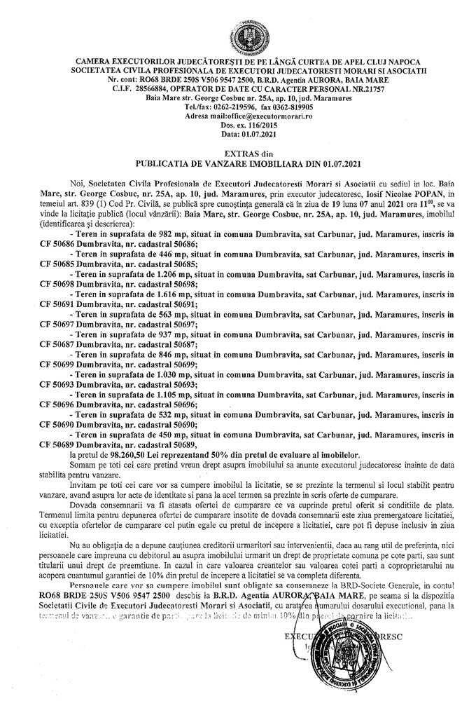 Noi, Societatea Civilă Profesională de Executori Judecătorești Morari și Asociații cu sediul în loc. Baia Mare, str. George Coșbuc, nr. 25A, ap. 10, jud. Maramureș, prin executor judecătoresc Iosif Nicolae POPAN în temeiul art. 839 (1) Cod. Pr. Civilă, se publică spre cunoștința generală că în ziua de 19 luna 07 anul 2021 ora 11.00 se va vinde la licitație publică (locul vânzării): Baia Mare, str. George Coșbuc, nr. 25A, ap. 10, jud Maramureș imobilul descris în documentul de mai jos: