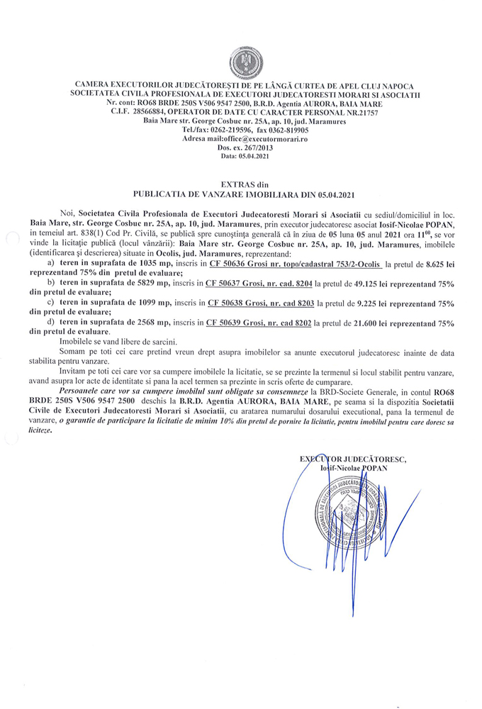 Noi, Societatea Civilă Profesională de Executori Judecătorești Morari și Asociații cu sediul/domiciliul în loc. Baia Mare, str. George Coșbuc, nr. 25A, ap. 10, jud. Maramureș, prin executor judecătoresc Iosif-Nicolae POPAN în temeiul art. 838(1) Cod. Pr. Civilă, se publică spre cunoștința generală că în ziua de 05 luna 05 anul 2021 ora 11.00 se va vinde la licitație publică (locul vânzării): Baia Mare, str. George Coșbuc, nr. 25A, ap. 10, jud Maramureș din imobilul descris în documentul de mai jos: