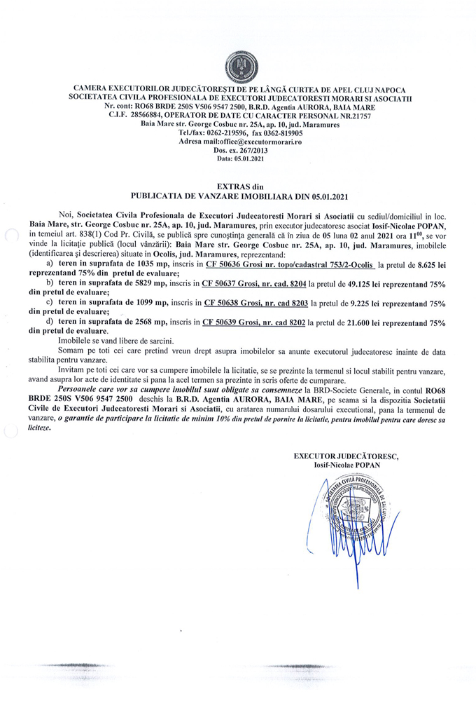 Noi, Societatea Civilă Profesională de Executori Judecătorești Morari și Asociații cu sediul/domiciliul în loc. Baia Mare, str. George Coșbuc, nr. 25A, ap. 10, jud. Maramureș, prin executor judecătoresc Iosif-Nicolae POPAN în temeiul art. 838(1) Cod. Pr. Civilă, se publică spre cunoștința generală că în ziua de 05 luna 02 anul 2021 ora 11.00 se va vinde la licitație publică (locul vânzării): Baia Mare, str. George Coșbuc, nr. 25A, ap. 10, jud Maramureș din imobilul descris în documentul de mai jos: