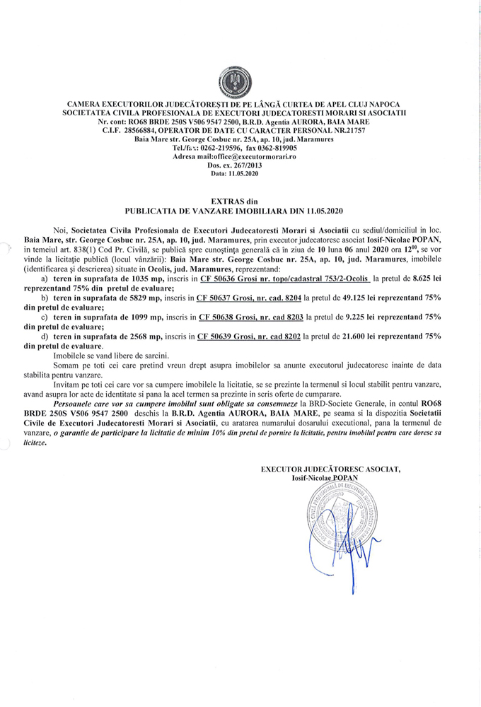 Noi, Societatea Civilă Profesională de Executori Judecătorești Morari și Asociații cu sediul/domiciliul în loc. Baia Mare, str. George Coșbuc, nr. 25A, ap. 10, jud. Maramureș, prin executor judecătoresc asociat Iosif-Nicolae POPAN, în temeiul art. 838(1) Cod. Pr. Civilă, se publică spre cunoștința generală că în ziua de 10 luna 06 anul 2020 ora 12.00, se va vinde la licitație publică (locul vânzării): Baia Mare, str. George Coșbuc, nr. 25A, ap. 10, jud Maramureș din imobilul descris în documentul de mai jos:
