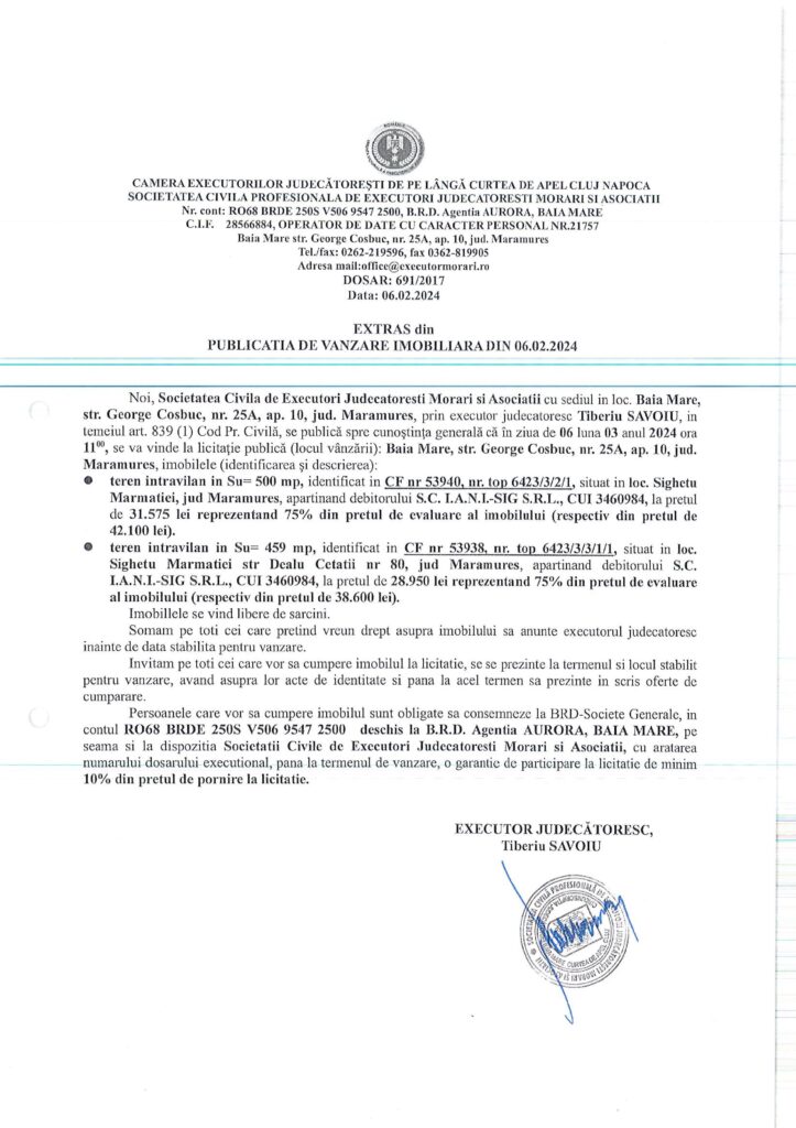 Vânzare terenuri intravilan în Sighetu Marmației – Extras publicație imobiliară, din data de 06. 02. 2024