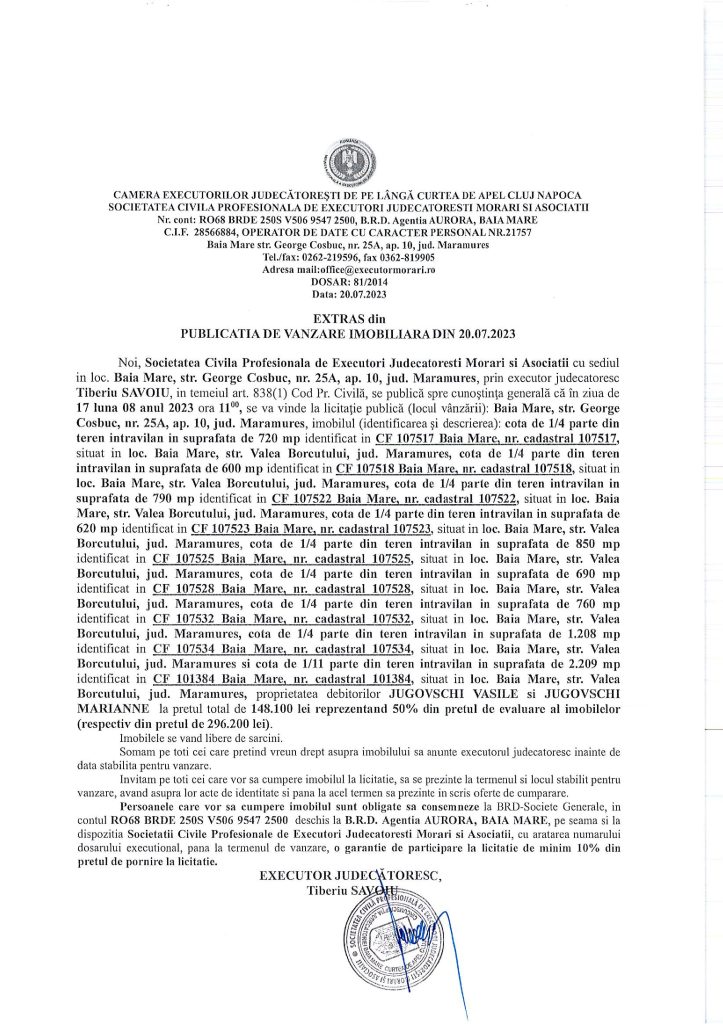 Vânzare terenuri intravilane în Baia Mare – Extras publicație imobiliară, din data de 20. 07. 2023