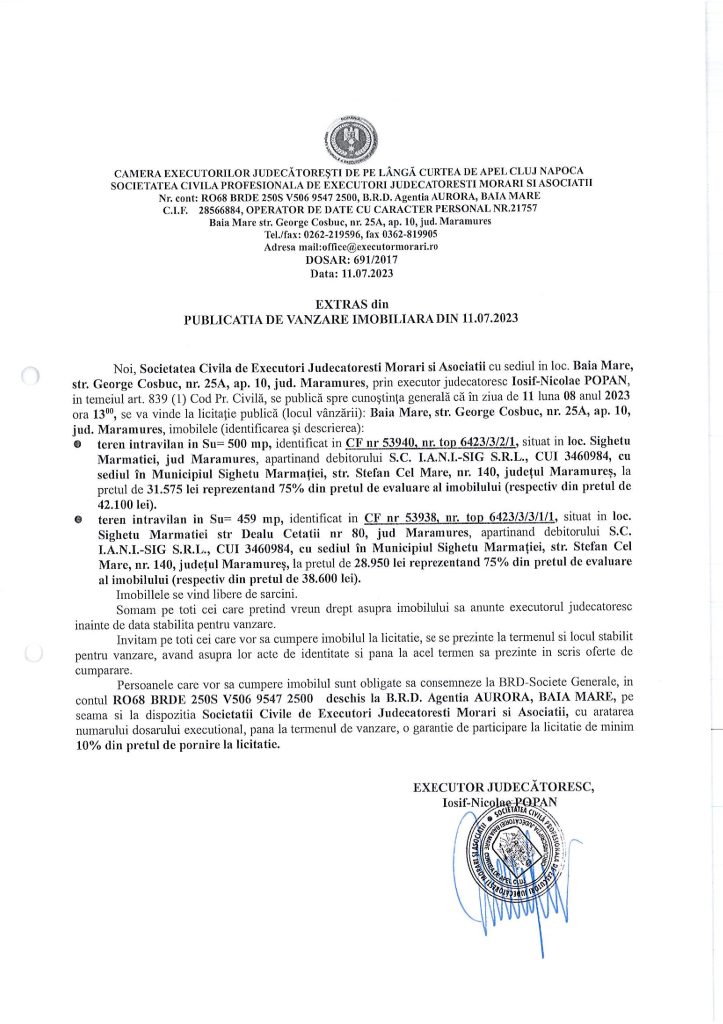 Vânzare terenuri intravilane în Sighetu Marmației – Extras publicație imobiliară, din data de 11. 07. 2023