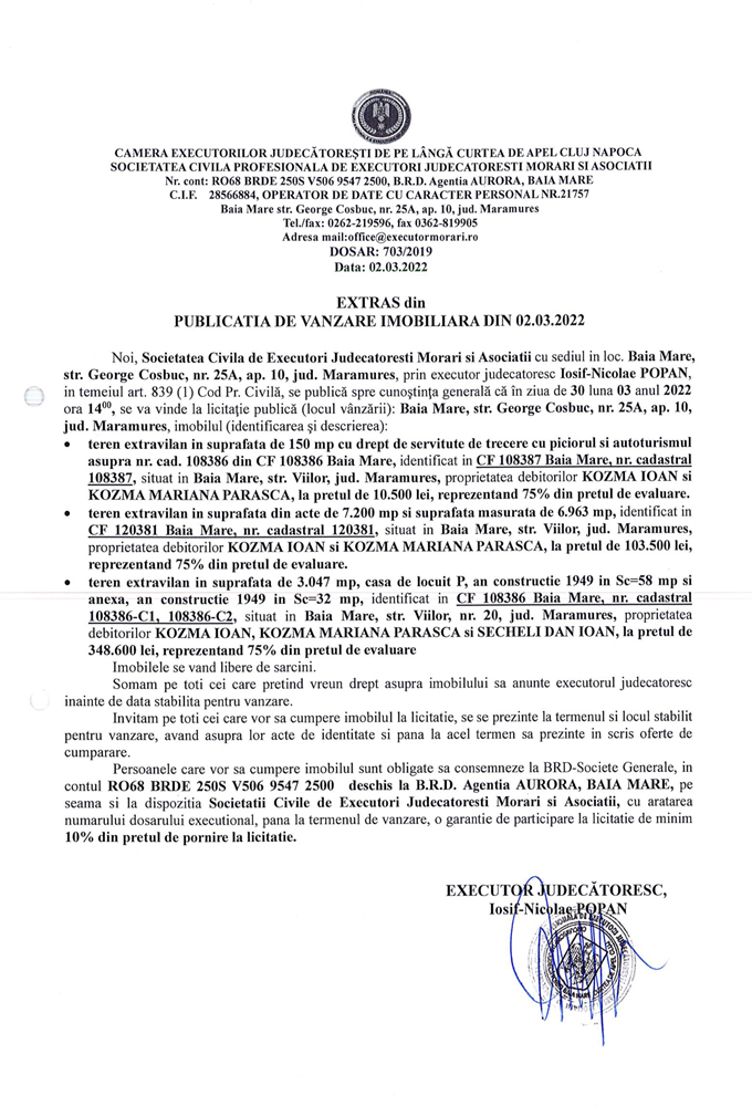 Noi, Societatea Civilă Profesională de Executori Judecătorești Morari și Asociații cu sediul în loc. Baia Mare, str. George Coșbuc, nr. 25A, ap. 10, jud. Maramureș, prin executor judecătoresc Iosif-Nicolae POPAN în temeiul art. 839 (1) Cod. Pr. Civilă, se publică spre cunoștința generală că în ziua de 30 luna 03 anul 2022 ora 14.00, se va vinde la licitație publică (locul vânzării): Baia Mare, str. George Coșbuc, nr. 25A, ap. 10, jud Maramureș, imobilul descris în documentul de mai jos: