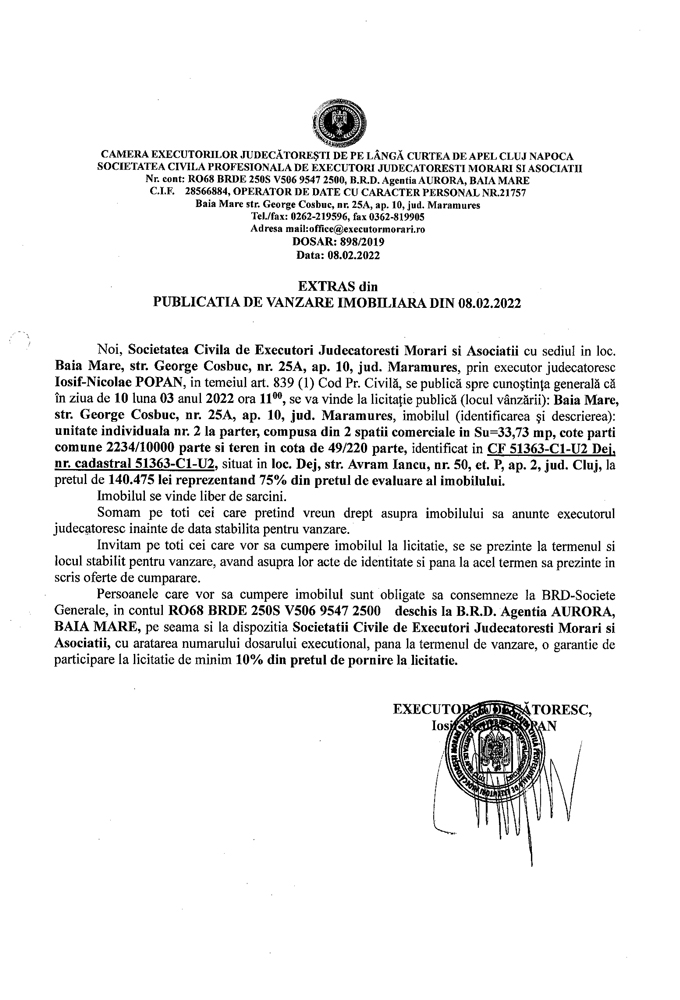 Noi, Societatea Civilă Profesională de Executori Judecătorești Morari și Asociații cu sediul în loc. Baia Mare, str. George Coșbuc, nr. 25A, ap. 10, jud. Maramureș, prin executor judecătoresc Iosif-Nicolae POPAN în temeiul art. 839 (1) Cod. Pr. Civilă, se publică spre cunoștința generală că în ziua de 10 luna 03 anul 2022 ora 11.00, se va vinde la licitație publică (locul vânzării): Baia Mare, str. George Coșbuc, nr. 25A, ap. 10, jud Maramureș, imobilul descris în documentul de mai jos: