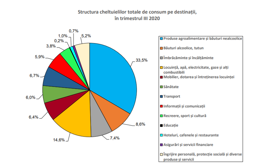 -dacă în trimestrul III din 2019 pentru produse agroalimentare și băuturi nealcoolice se alocau 31,3% din cheltuieli, în trimestrul trei din 2020 procentul a crescut la 33,5%;