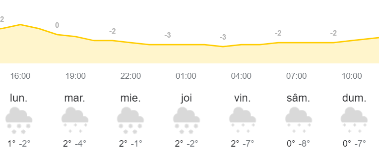 Potrivit prognozei meteo oferită de weather.com, de luni și până duminică va ninge în fiecare zi, iar nopțile vor fi friguroase cu temperaturi sub 0 grade.