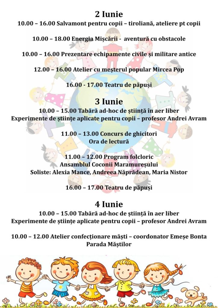 Între orele 10:00-18:00, copii sunt invitați să participle la activități precum tiroliană, ateliere de pictură, ateliere de confecționare măști, momente artistice, pictură pe față, canto clasic, canto popular, muzică și dansuri populare, basme, concursuri de ghicitori, experimente de științe aplicate, observații astronomice asupra soarelui, lumea mineralelor, prezentare echipamente militare antice, dar și multe alte surprize.