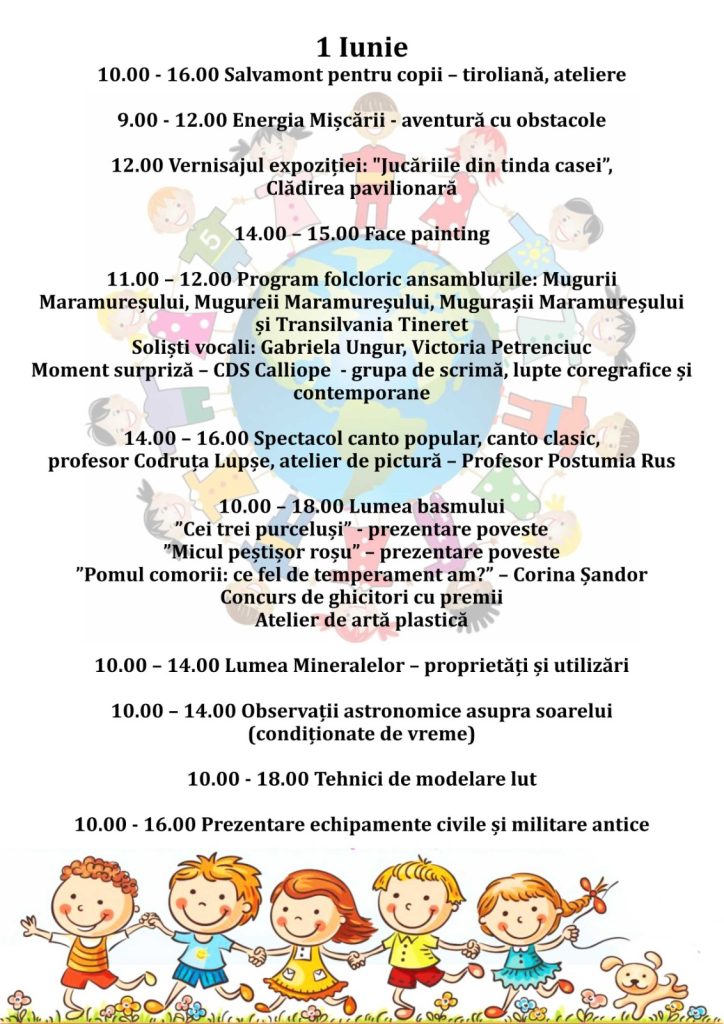 Între orele 10:00-18:00, copii sunt invitați să participle la activități precum tiroliană, ateliere de pictură, ateliere de confecționare măști, momente artistice, pictură pe față, canto clasic, canto popular, muzică și dansuri populare, basme, concursuri de ghicitori, experimente de științe aplicate, observații astronomice asupra soarelui, lumea mineralelor, prezentare echipamente militare antice, dar și multe alte surprize.
